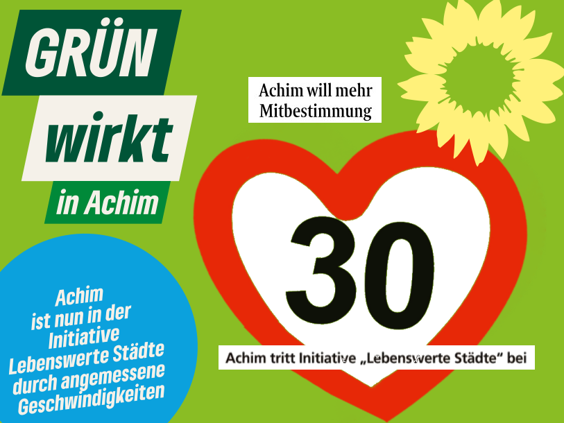 Mit 22 anderen Kommunen ist die Stadt Achim am 3. Januar 2024 Mitglied der Initiative Lebenswerte Städte und Gemeinden geworden. Aktuell sind in diesem Zusammenschluss 1043 Städte, Gemeinden, Landkreise und ein Regionalverband aktiv, um mehr Entscheidungsfreiheit für das Geschwindigkeitsniveau des Kfz-Verkehrs zu fordern.