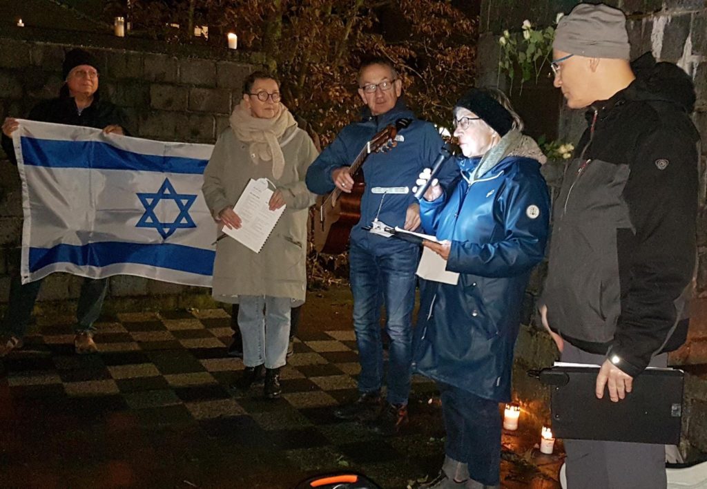Flackernde Windlichter, weiße Rosen und Plakate mit der Aufschrift „Nie wieder!“ haben einen Platz gefunden auf oder vor den symbolischen Mauerresten der ehemaligen Achimer Synagoge. Die Menschen stehen dicht gedrängt auf dem „Synagogenplatz“, darunter Bürgermeister Rainer Ditzfeld und der Erste Stadtrat Daniel Moos. Es sind noch mehr als im letzten Jahr, und die Zusammensetzung hat sich verändert: Auch Kinder, Jugendliche und junge Erwachsene sind dabei.